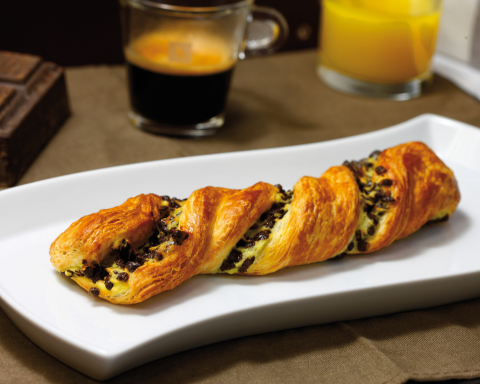 An irresistible recipe of pure-butter croissant dough, with vanilla custard and chocolate chips.