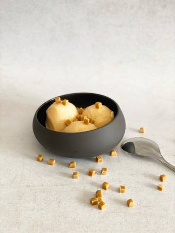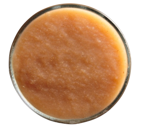 Dark beige and velvety, the purée retains a smooth texture and floral notes of rose, showcasing the rustic fruit's full intensity without added sugar, delivering a fresh and acidic sensation.