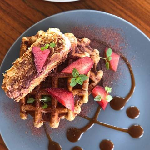 Premium authentic Belgian or Liege waffles. Extra-large and deep square pockets that you can fill with butter, jam, or maple syrup.