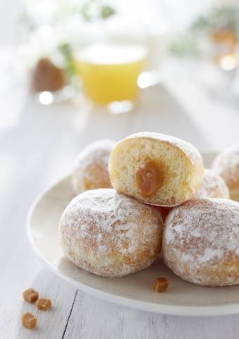 Soft dough filled with caramel cream, with white chocolate coating, and decorated with a crunchy caramel topping. Frozen, ready to use. Thawing time: 45 minutes. Shelf life: 96 hours at room temperature.
